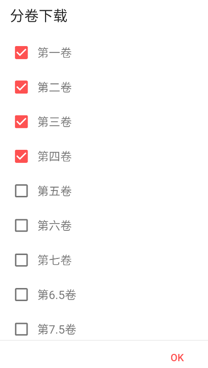 4、进入分卷下载界面后,请仔细勾选您希望下载的小说内容。确认无误后,点击屏幕右下方的【OK】按钮,即可开始下载您所选的小说章节。