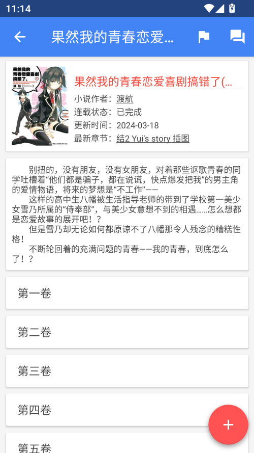 1、浏览至小说简介页面,点击屏幕右下方的红色【+号】按钮,以展开更多操作选项。