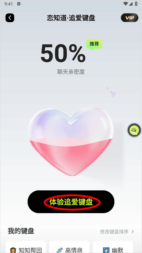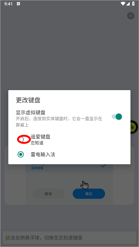 4、点击页面中的悬浮球在弹出界面中点击追爱键盘即可。