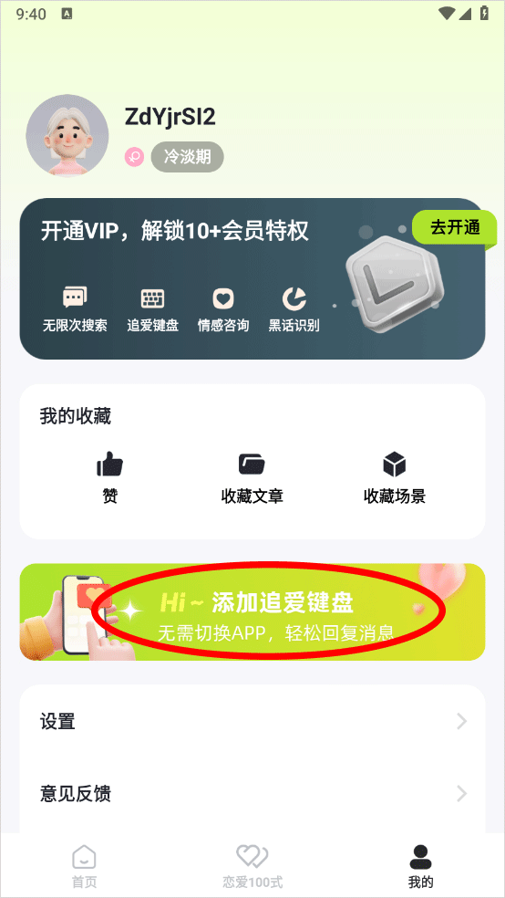 2、进入个人页面点击小编标出来的地方进入追爱键盘界面。