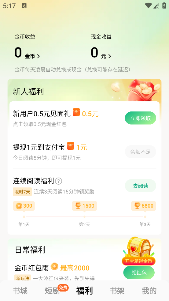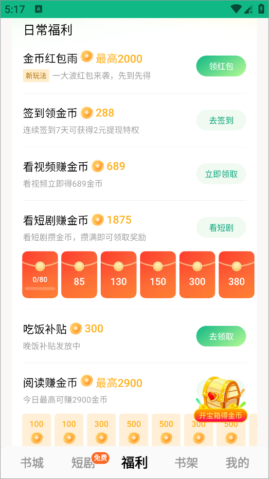 3、除新人福利活动以外,下滑可以看到日常福利,每天都可以看视频、签到、看短剧等方式获得金币