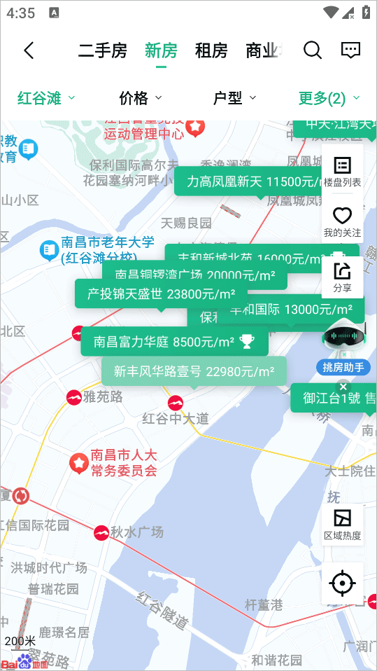 2、地图上会根据你目前所在的城市划分地区为你推荐不同地方的房子,还可以挑选不同类型的房子