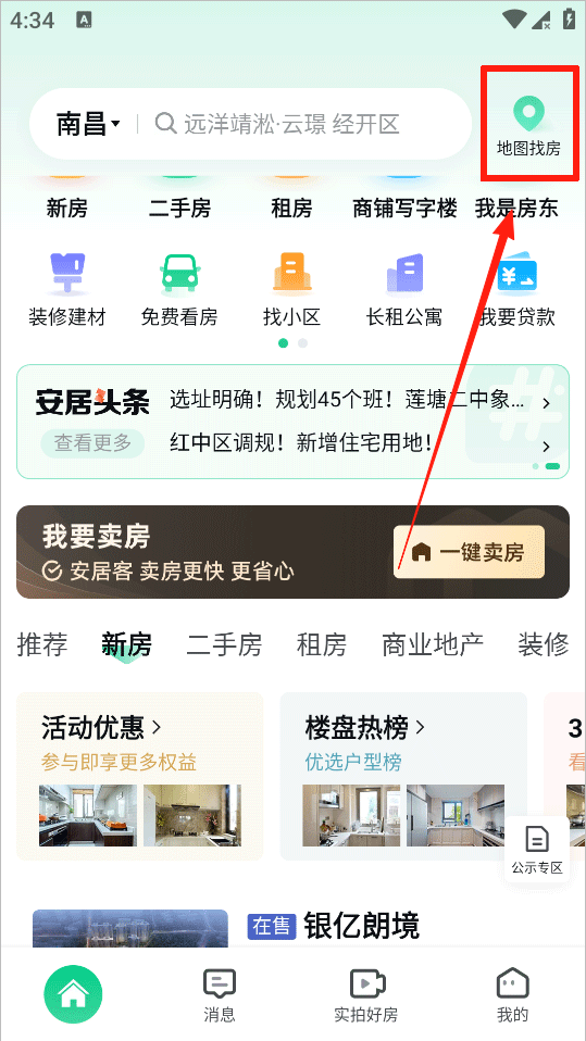 1、进入安居客app官方最新版首页后可以点击右上角地图找房