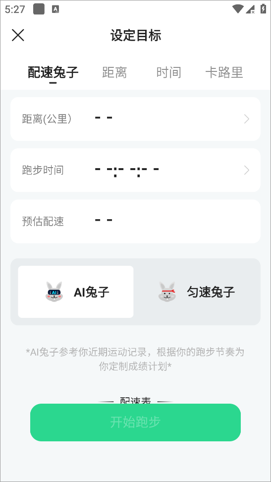 在“去跑步”页面点击开始左边的目标,即可设定公里数以及其他详细目标