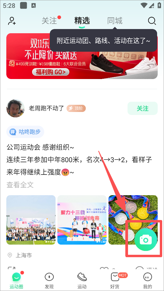 点击最下方菜单栏的“运动圈”,进入动态社区后点击右下角的拍照即可上传图片或者视频