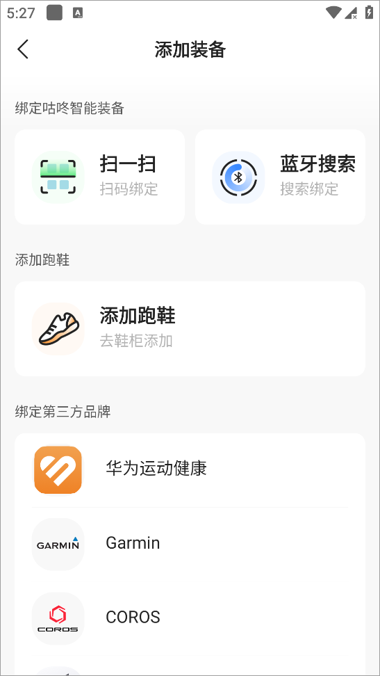 点击最上方的添加装备可以用扫码、连接蓝牙的方式绑定运动手表或其他的运动设备