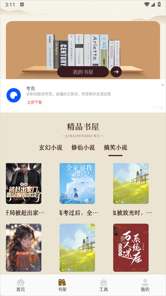 2、书架界面会存放你喜欢的书籍以及为你推挤精选书籍