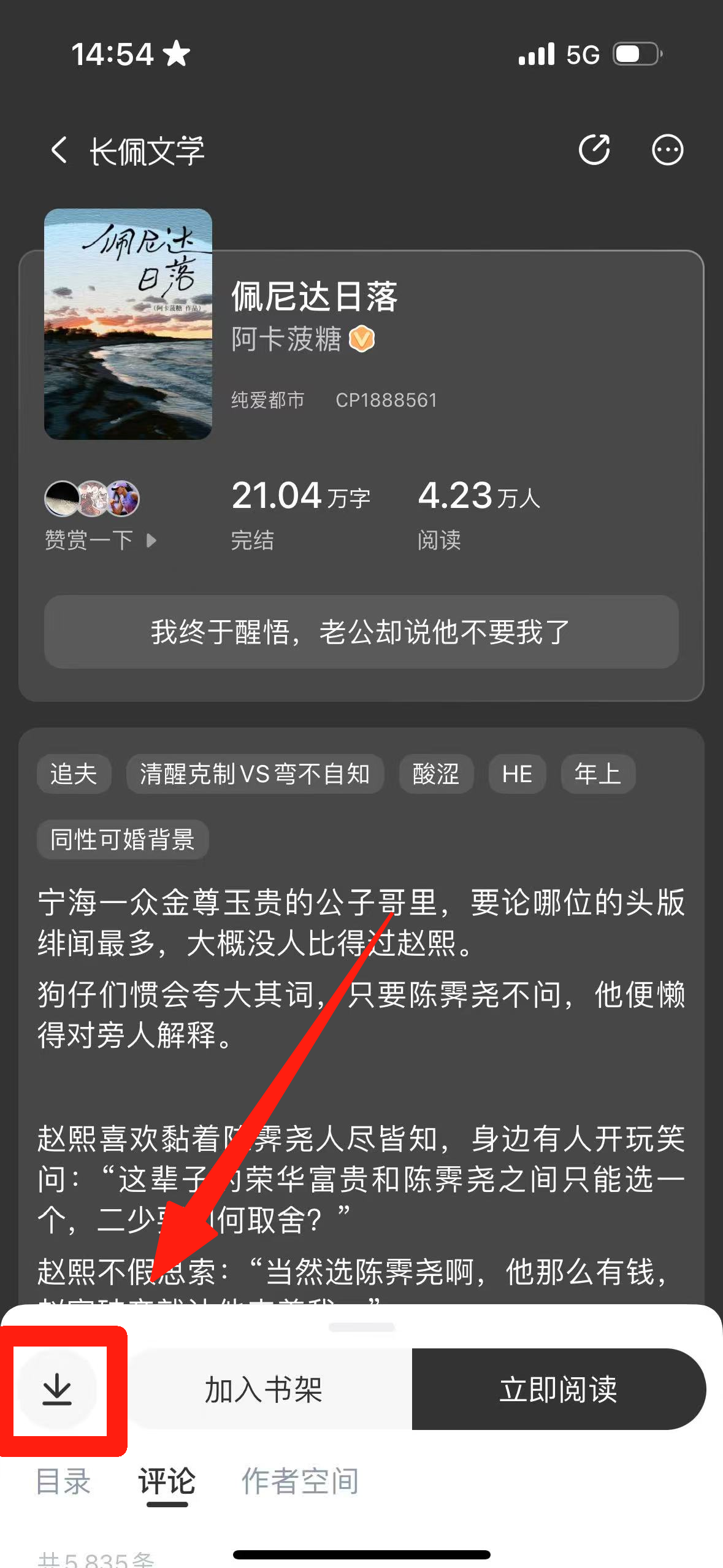 3、除小说主页以外还可以下载阅读小说的界面进行下载,轻轻点击屏幕出现菜单栏,再点击右上角的下载