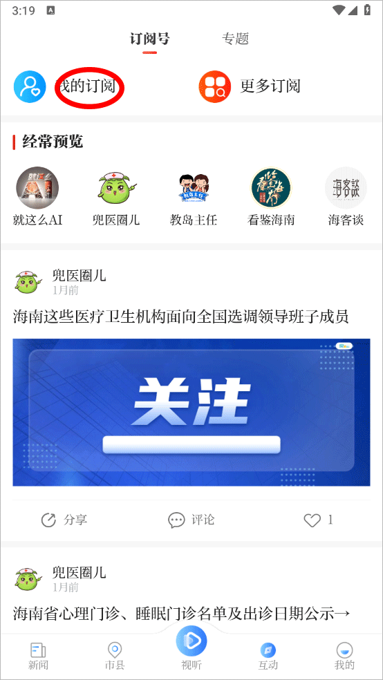 2、进入互动页面点击我的订阅