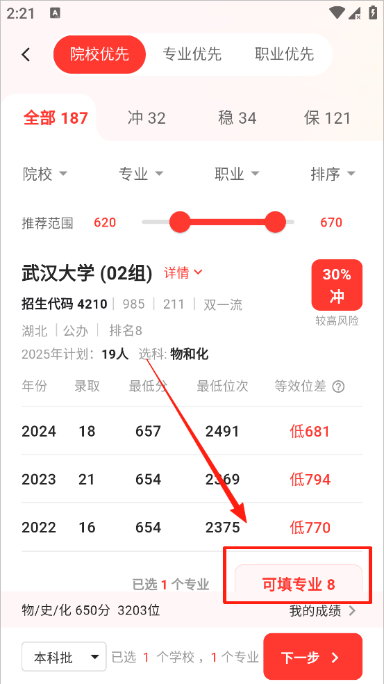 3、正式进入选择学校和专业的页面,这里会根据你所填的分数,推荐合适的学校点击“可填专业”