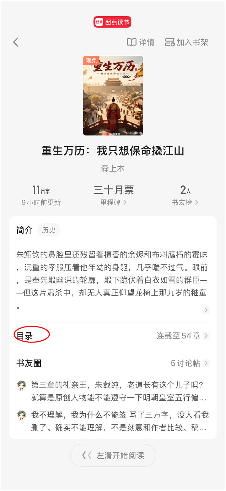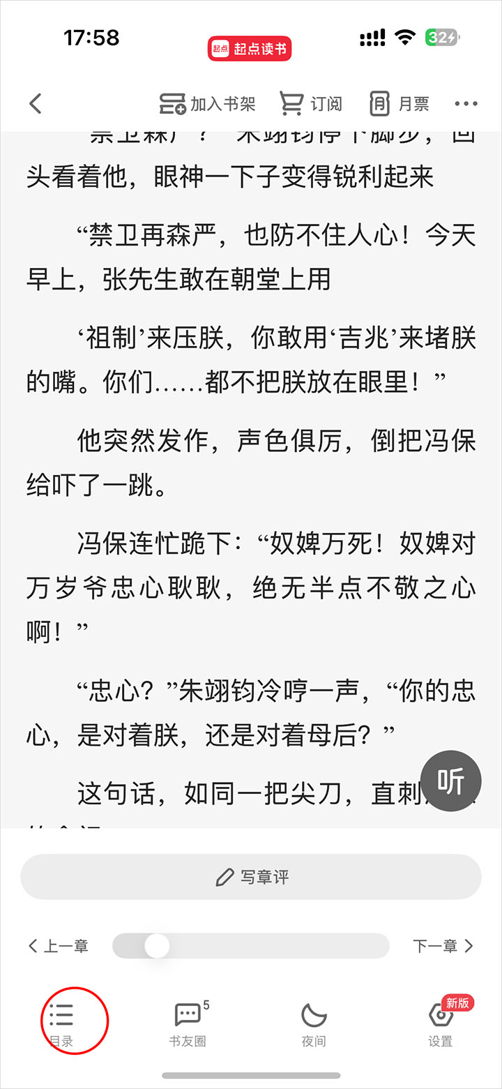5、如果想看其他章节的内容,点击下屏幕任意位置,底部就会出现选项,点击左下角“目录”;