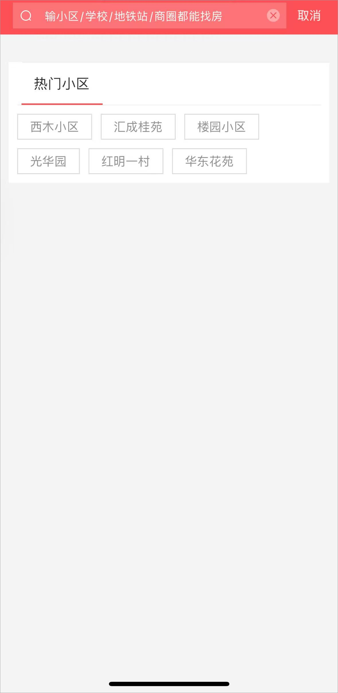 2、点击最上方的搜索框可以直接搜索用户感兴趣的小区,或者附近的地方地铁、商圈等,app会自动为你搜索附近的房源