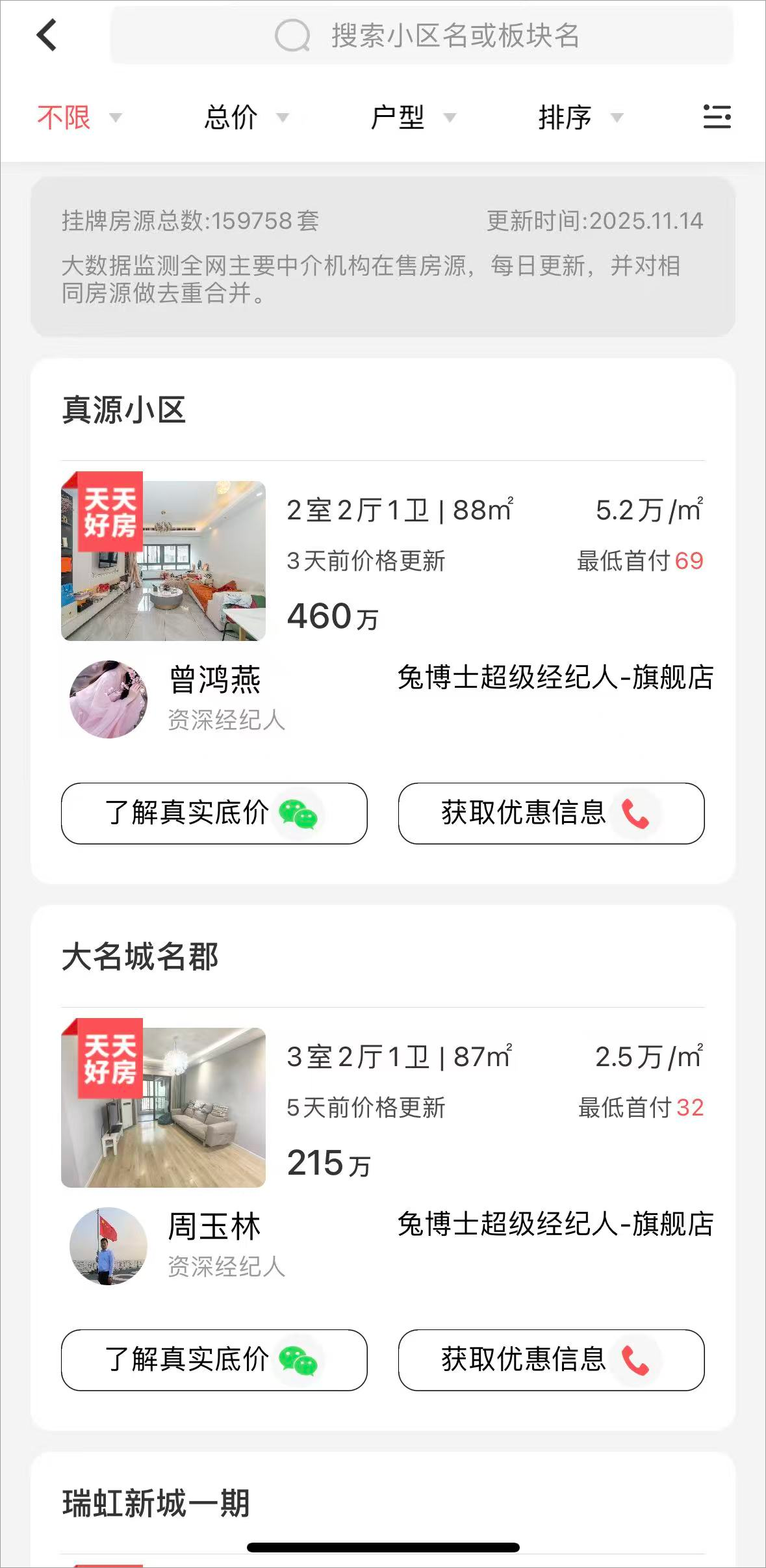 各家机构海量真实成交信息整合发布,住宅小区历史交易套数、成交价格、房价走势一目了然,兔博士用先进的大数据技术最大限度消灭信息不对称,让您再也不会被虚假信息蒙骗了!