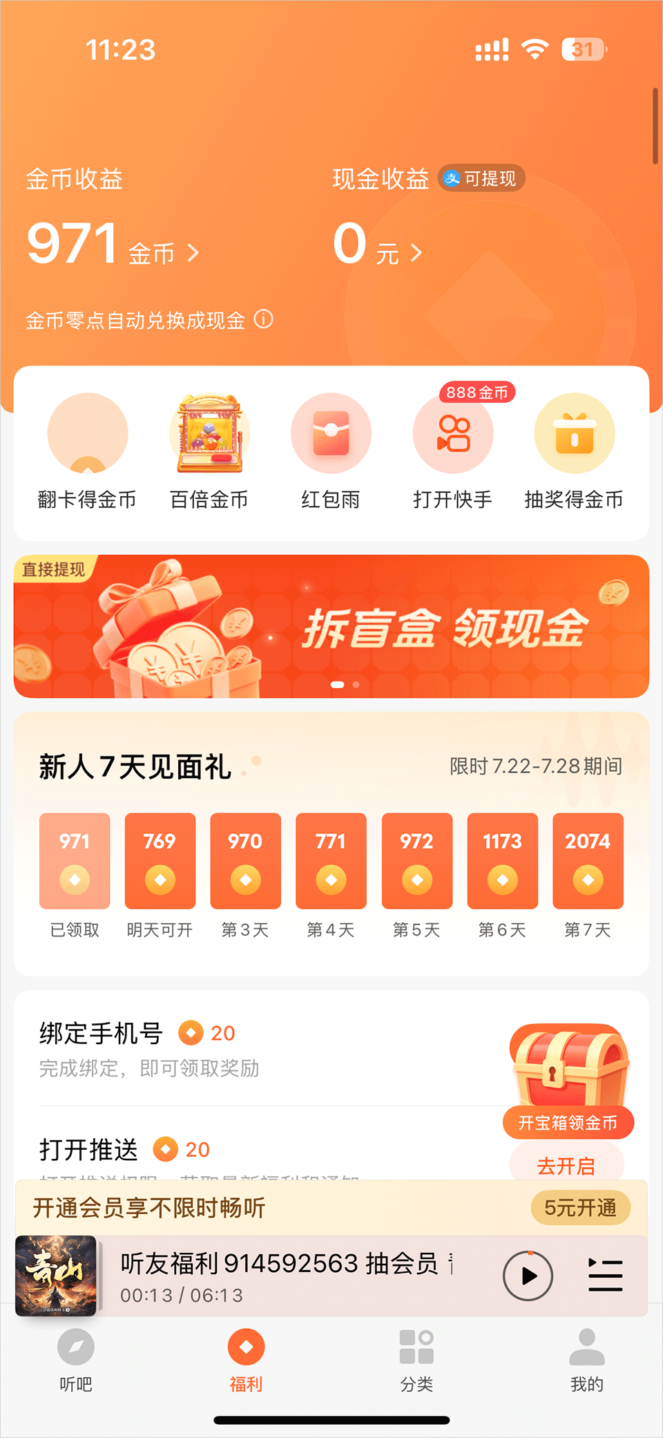 4、【听书赚钱】新人红包、听书赚钱、签到打卡、实物兑换......超多玩法!轻松赚钱,轻松提现,秒到账。