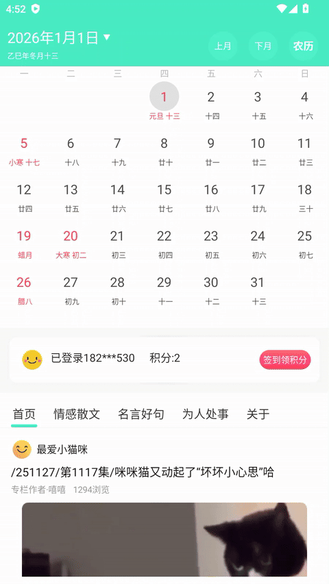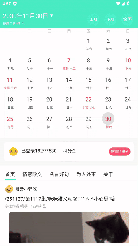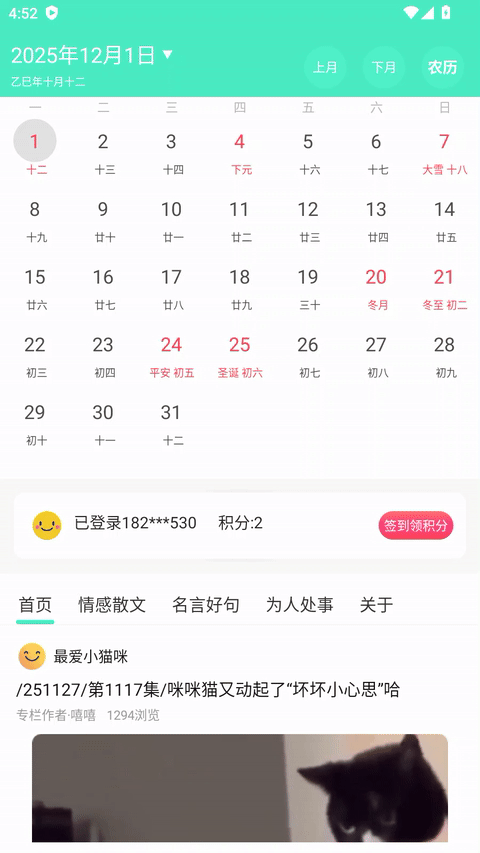 天天日历app是一款日常生活必备软件,用户可以在线查看每天日历,还能清楚的记录生活日常的点点滴滴,根据时间的日积月累,拥有一个属于自己的日历故事。并且提供提功能,用户可以根据事件设置好时间,进行提醒,可以让用户不会错过重要的时间,不管是生活还是工作活,天天日历都是你得力的时间管理助手。同时天天日历app提供每日的宜忌与五行信息,有效帮助用户合理安排出行计划,还内置了丰富的情感散文与原创小说,让用户可以在闲暇时光享受阅读的乐趣。