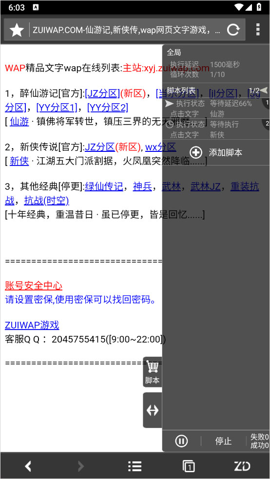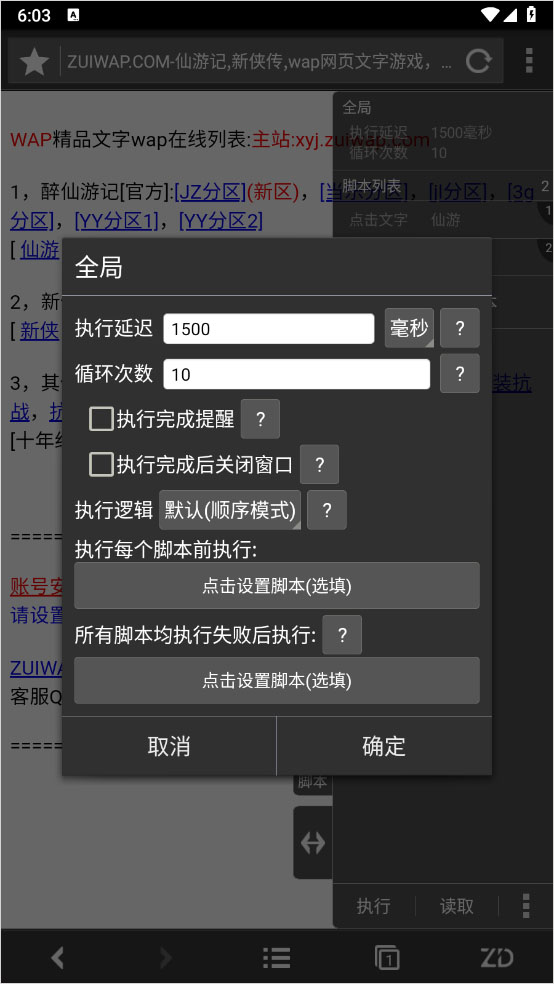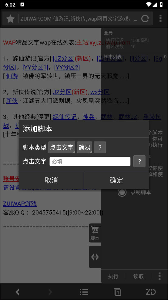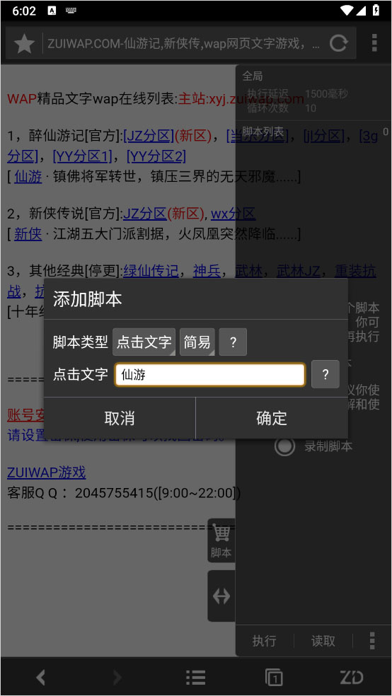 2、点击脚本列表中的添加脚本,在弹出脚本对话框里选择点击文字-简易,在“点击文字”对话框输入“仙游”,也就是我们要刷的,然后点击对话框的确定按钮。