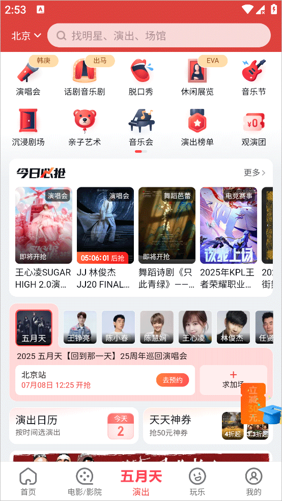 3、演出界面可以看到当前ip最近的演唱会、音乐节、脱口秀等多种表演信息,也可以切换ip进行购买其他地区的演出