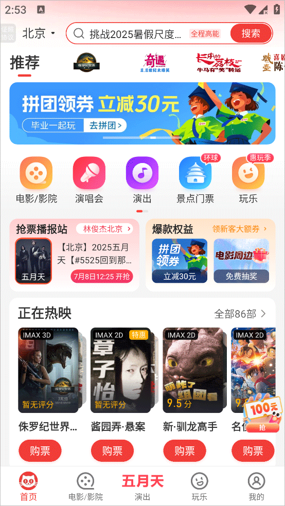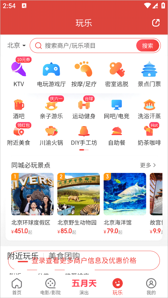4、玩乐页面有ip的各种娱乐项目,比如KTV、电玩、按摩等放各种松心情的项目,此外还可以购买美食卷以及各个地区的景点门票