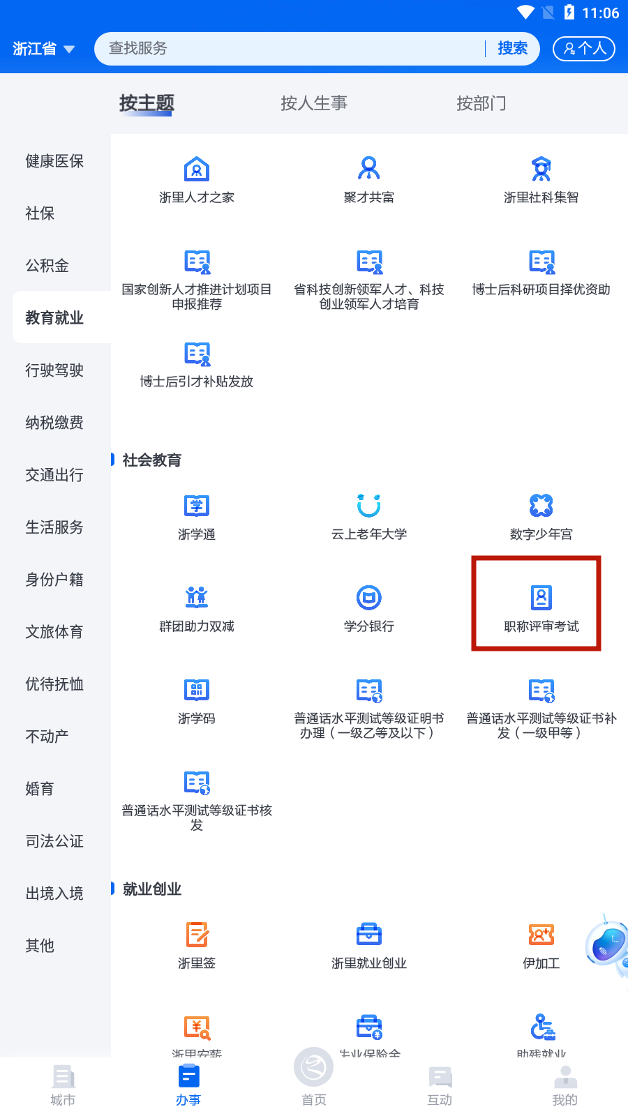 2、选择“教育就业”分类,下划找到“职称评审考试”。