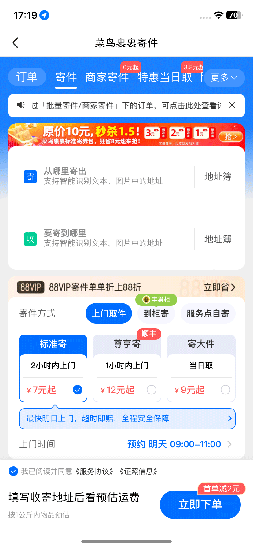 - 上门寄:2小时极速上门揽收,省时省心,超时必赔