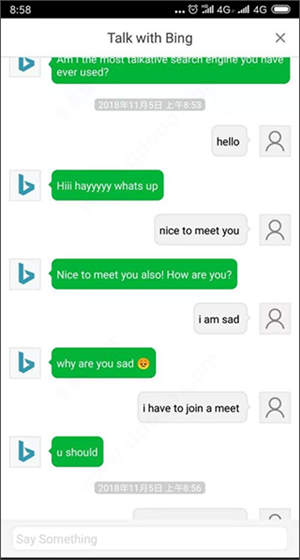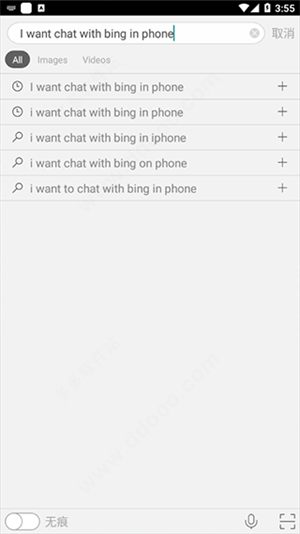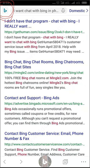 2、在输入框中输入“ I want chat with bing in phone", 手机上输入其他的文字不会调出 AI对话机器人,只有简单的搜索功能。