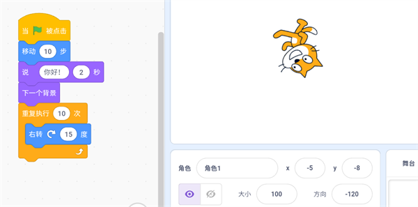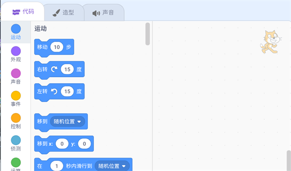 界面已更新。舞台区向右移动,程序置于中间,更方便程序员编程;区块区域不再严格划分,可以通过鼠标滑动选择区块,降低点击率,增加用户体验