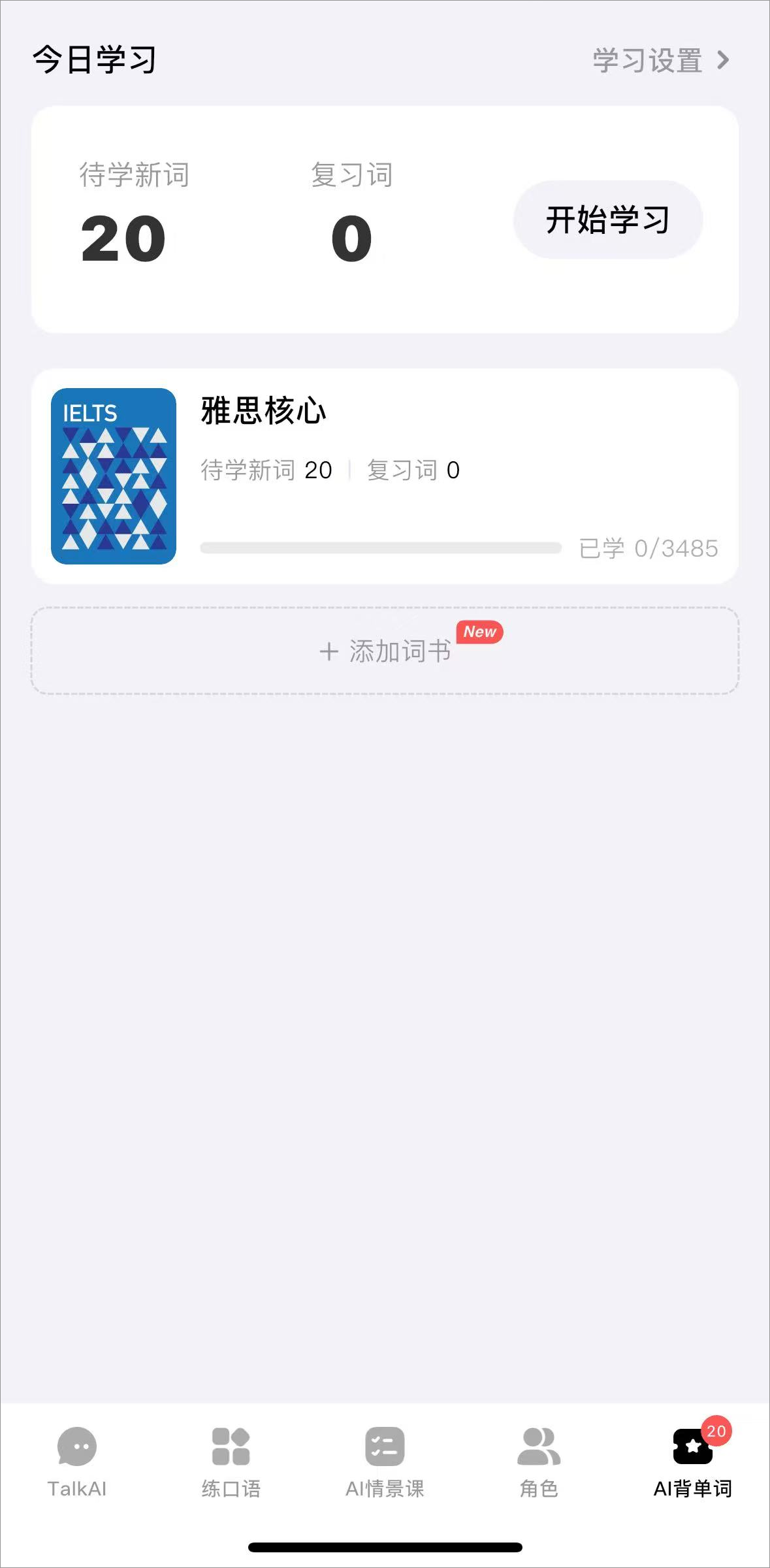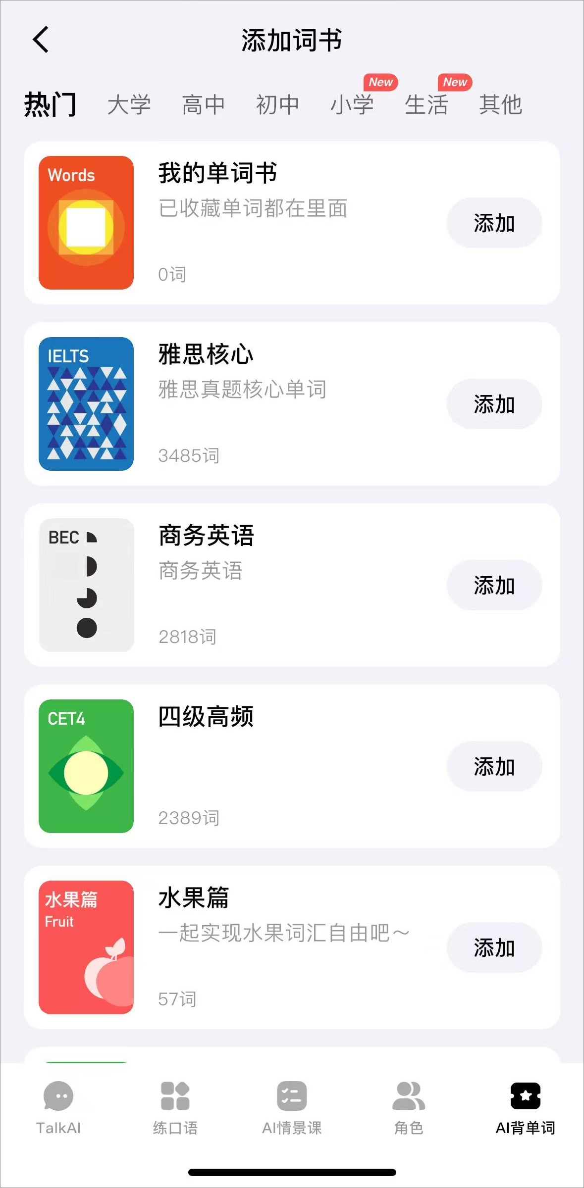6、点击添加词书可以看到软件内覆盖了从小学到大学四六级、雅思、托福、GRE等不同水平的单词书,满足了各个层次用户的学习需求,并且还可以自己创建单词本导入单词。