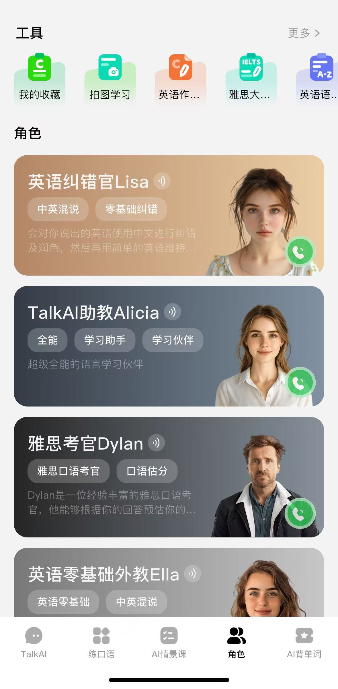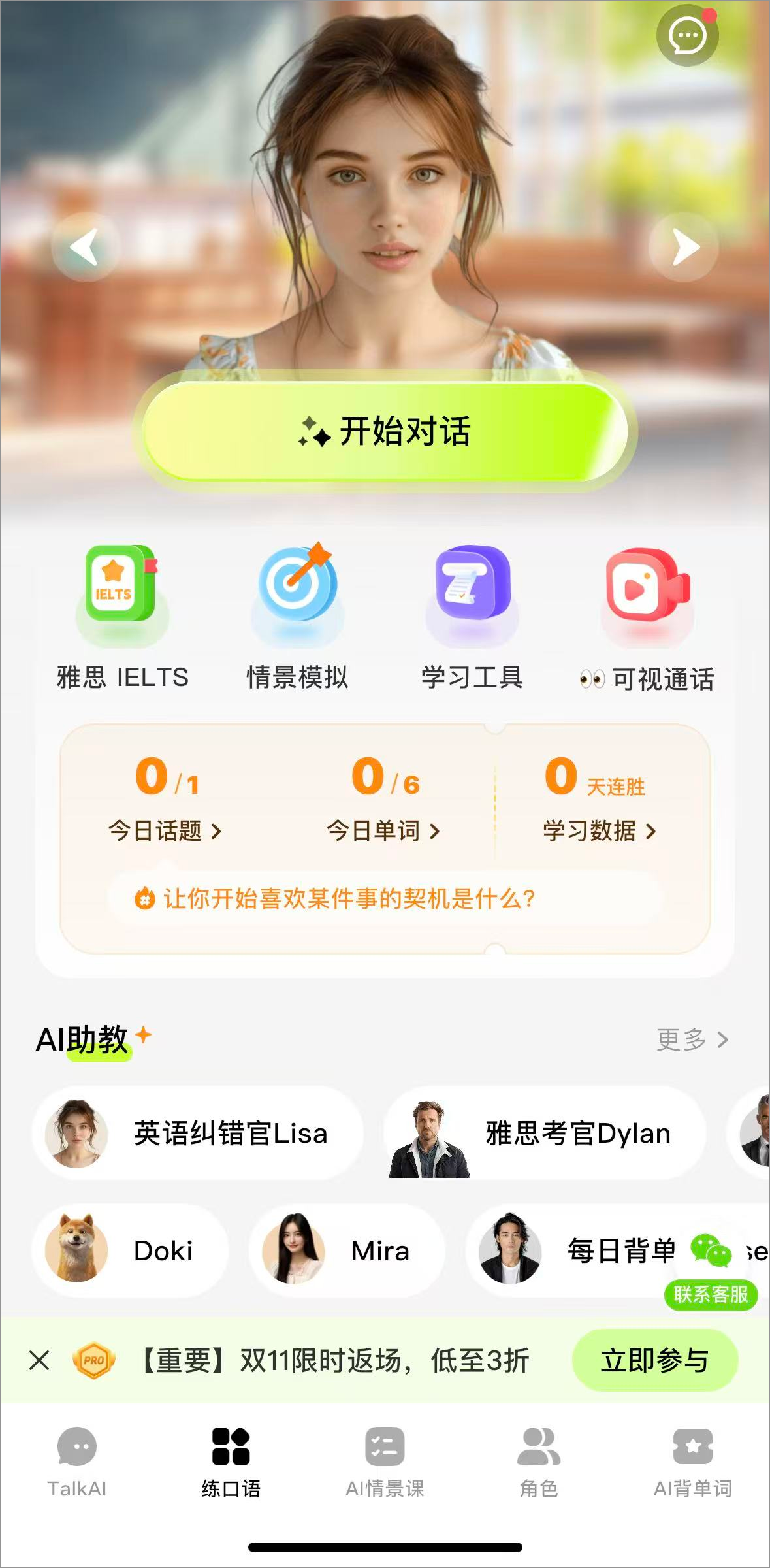 不敢开口、害怕说错,是语言学习的最大阻碍。TalkAI练口语的AI老师个个性格nice,你可以放心开口,大胆表达,逐步锻炼口语能力,向哑巴英语Say Goodbye。