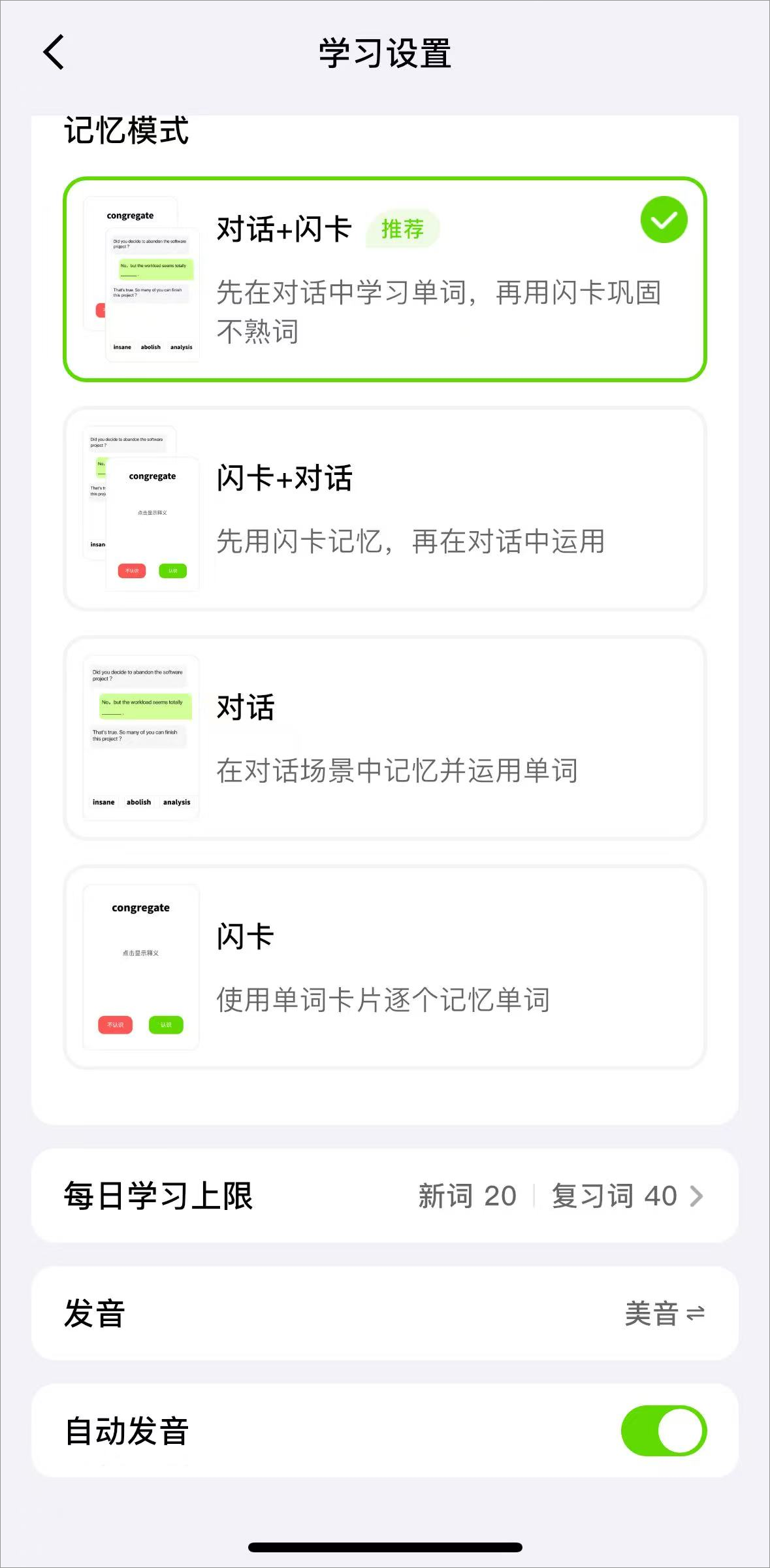 7、点击右下角的学习设置还可以设置不同的学习模式和每日学习的单词数量