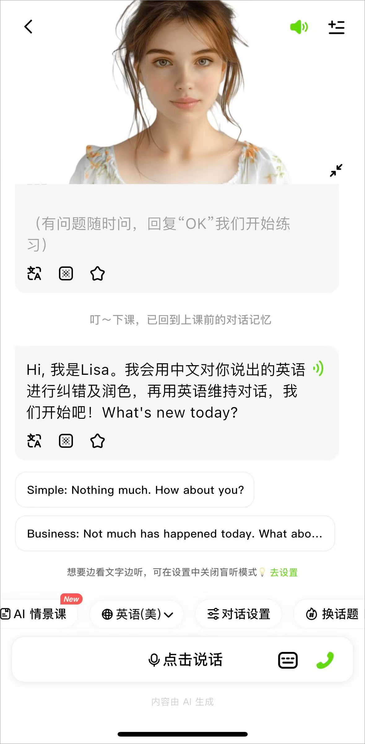 2、可以和ai进行互动学习口语,利用AI沉浸实时通话技术边看文字边听学习口语,体验到仿佛与真人面对面练习