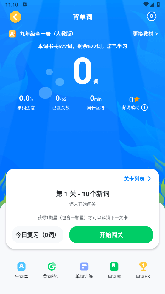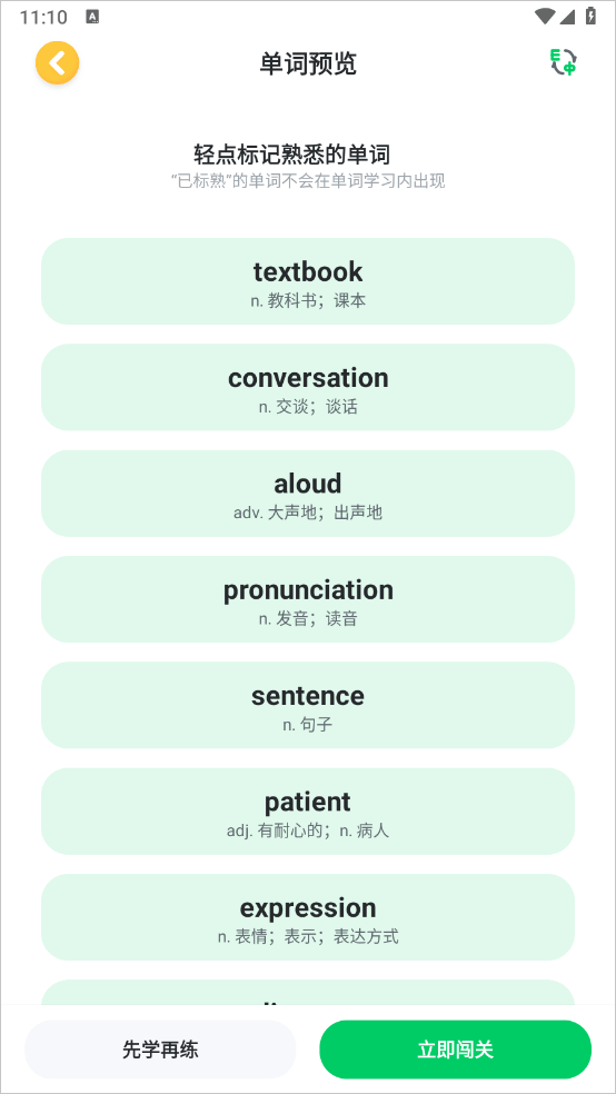 4、可以选择学习一遍再练或者直接开始闯关背单词
