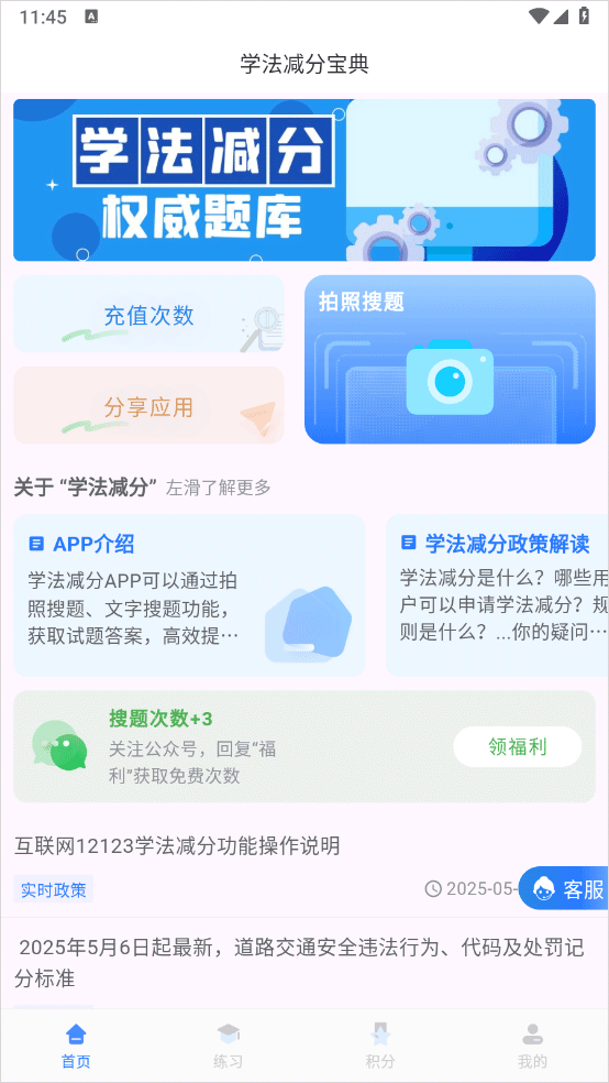 1、打开软件进入首页即可拍照搜题,还可查看12123学法减分操作等资讯