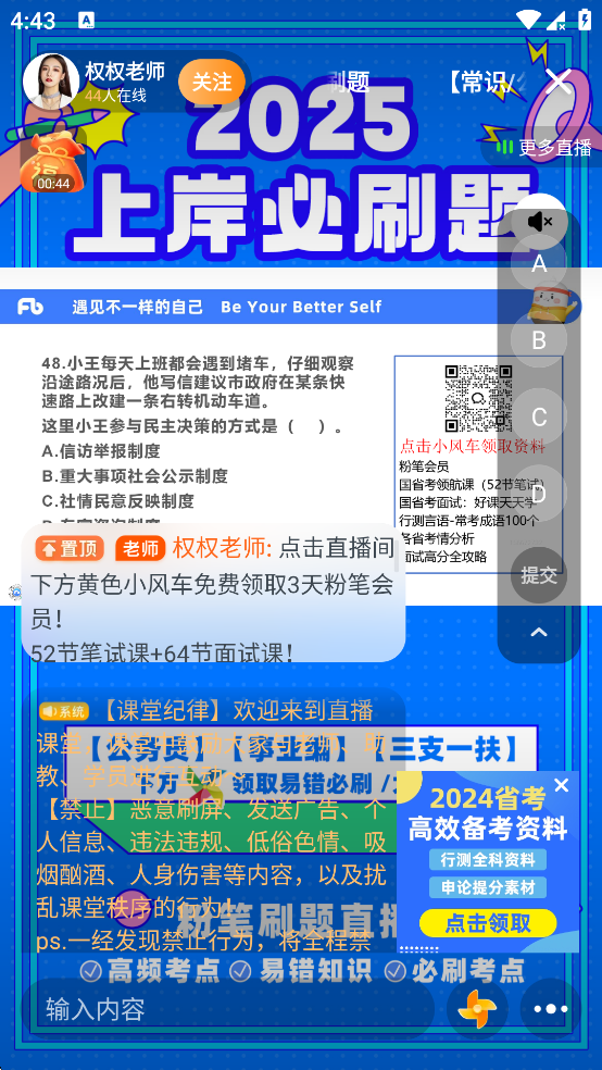 5、除视频学习,刷题以外还可以观看直播,和老师互动进行提问