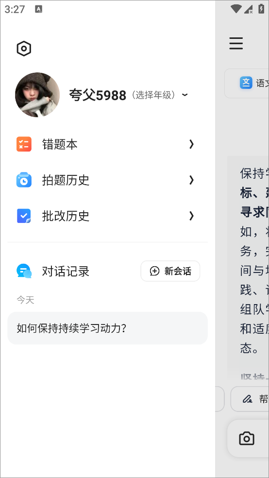 5、回到夸克老师首页点击左上角三横,可以进行拍题解答与作业批改,还可以查看往期的搜索记录