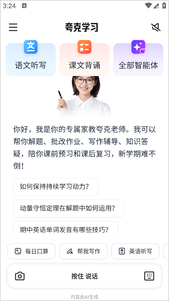 夸克学习app是一款AI智能学习工具软件,app内提供了知识丰富的虚拟老师,利用先进的人工智能技术,帮助学生背诵古诗、讲解数学题、纠正英语发音等。支持全学科作业批改,能够追踪作业数据,精准定位学生的薄弱点,并提供错题的深度讲解以及相关的练习题。还能够识别手写体并进行拍照批改,从内容、结构、语言等多维度分析作文,给出提分建议。通过强大的数据分析和评估功能,帮助学生了解自己的优势和不足,并做出相应的改进和调整帮助用户提高学习效率和质量。