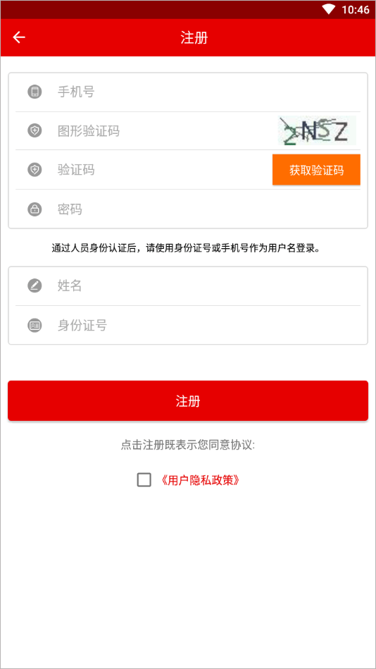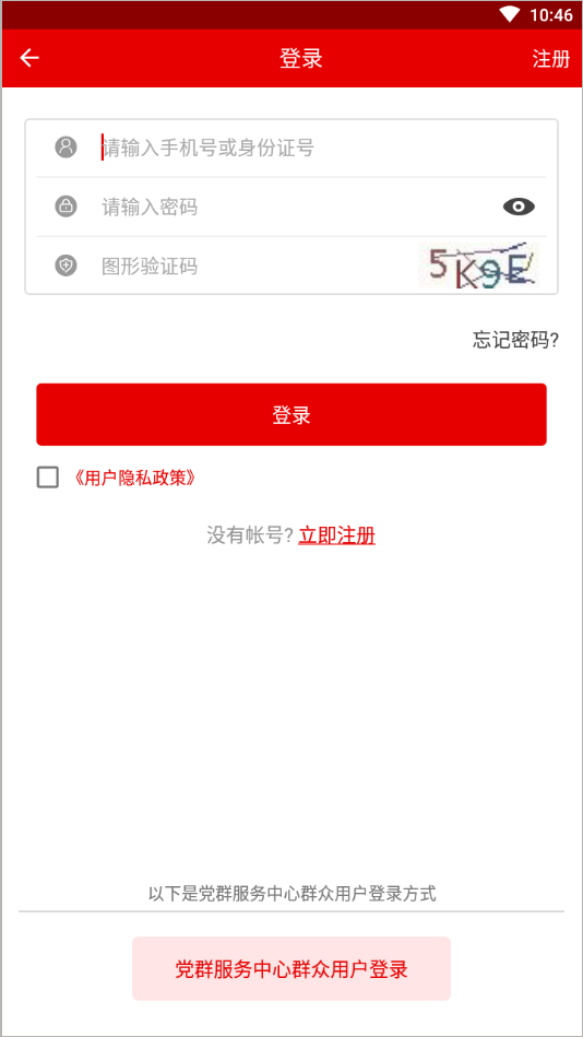 3、进入“登录”界面后,如果已经注册过账号就可以输入用户名(手机号或者身份证号都可以)和密码直接登陆了,如果没有注册,则可以点击右上角“注册”或者下方“立即注册”进行账号注册。