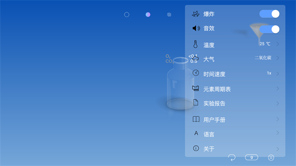 1、点击右下角,我们可以对游戏进行相应的设置操作,包括了:爆炸、音效、温度、大气、时间速度、元素周期表、实验报告等等。