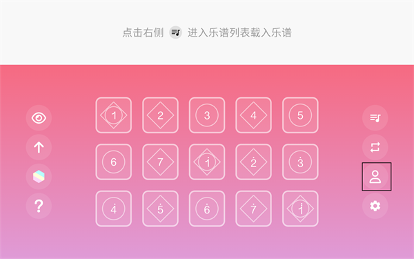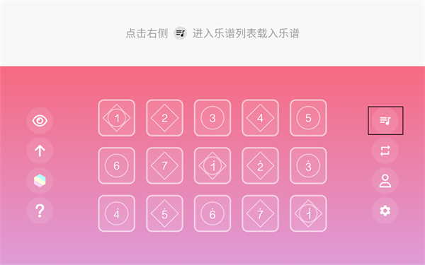 1、进入软件首先看到的就是弹琴页面。点击右侧第一个图标,就可以选择乐谱。