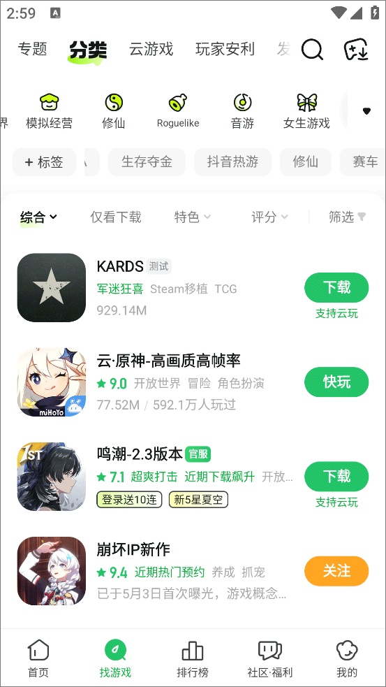 2、【找游戏】可以按照分类筛选或者查找自己感兴趣的游戏类型