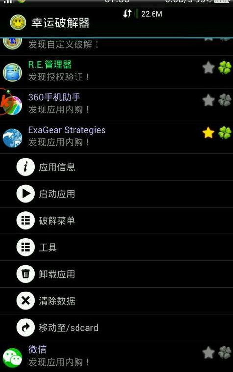 3.下载幸运破解器(注:幸运破解器一定要最新版不然没有移除内购功能)点击ExaGear选择破解菜单在选择第二项,如下图
