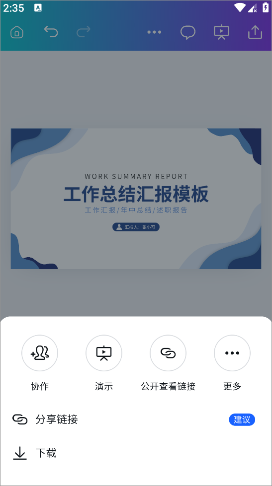 5、制作好ppt后点击右上角即可下载保存本地,也可以直接分享链接,打开后会自动跳转ppt内容,还可以添加协作人员和其他人一起编辑ppt内容