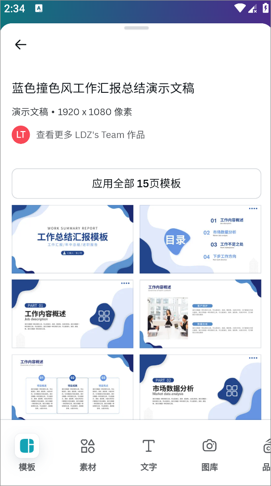 3、点击模版可以查看所有页面的设计图,挑选好模版后点击“应用全部模版”