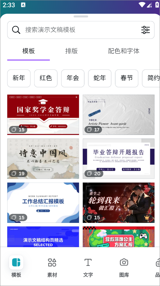 2、进入演示文稿后可以查看各种不同的模版,可以筛选需要的元素也可以直接搜索
