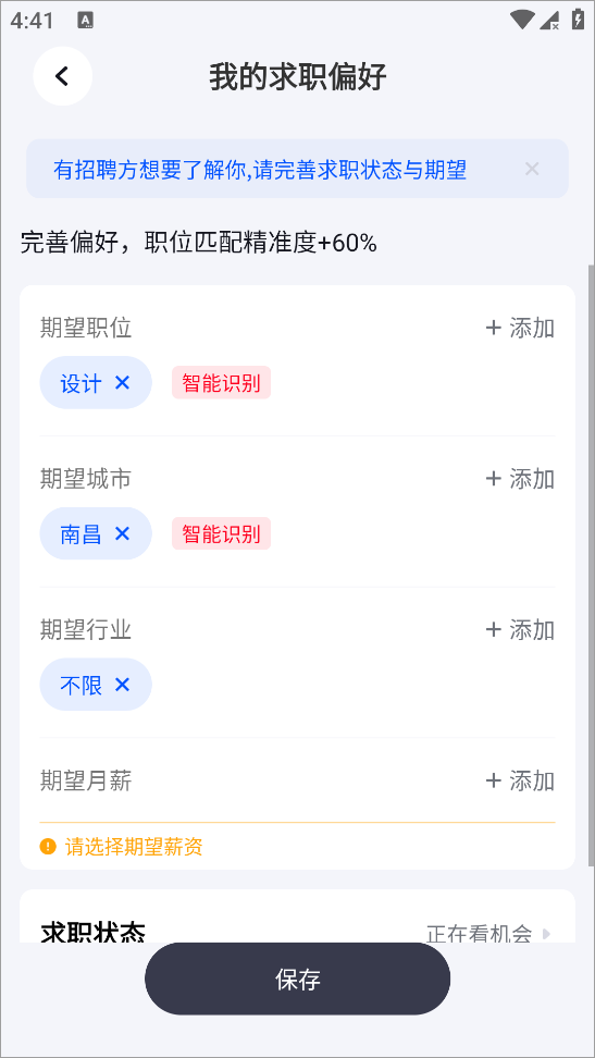 5、此外点击最上方的求职偏好,填写详细的信息后app会根据填写情况自动匹配合适的职业