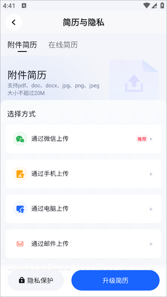 2、在查看具体岗位前需要点击职位页面的简介与隐私上传自己的简历