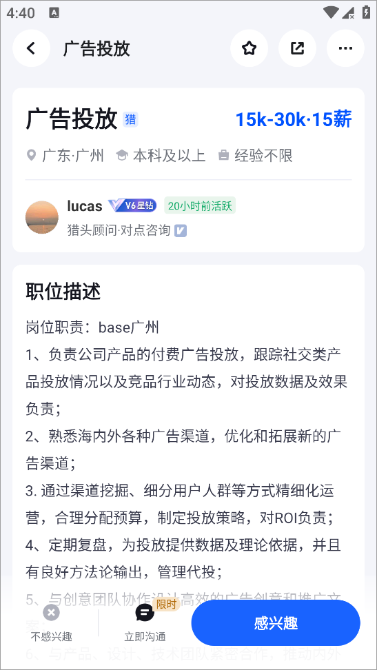 4、点击进入岗位详情页面可以看到更详细的介绍,找到合适的岗位后点击右下角的“感兴趣”即可投放简历
