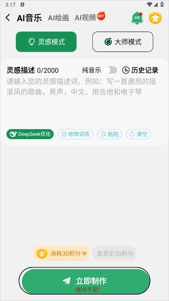 AI音乐生成器,释放你的创作潜力。更便民的文本生成AI音乐神器,汇集原创音乐社区,实现AI作曲创作,AI智能作词,结合AI多样伴奏,适合超多编曲音乐人、教育口诀制作人、抖音制作人等,让我们共同构建一个充满创新与音乐艺术的世界。