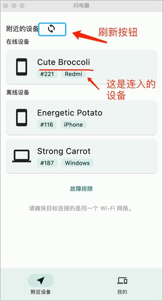 首先连接两个设备,当两个闪电藤/localsend启动时,并且他们在同一个局域网时,就能自动发现他们,如果发现不了,就点刷新按钮刷新一下。