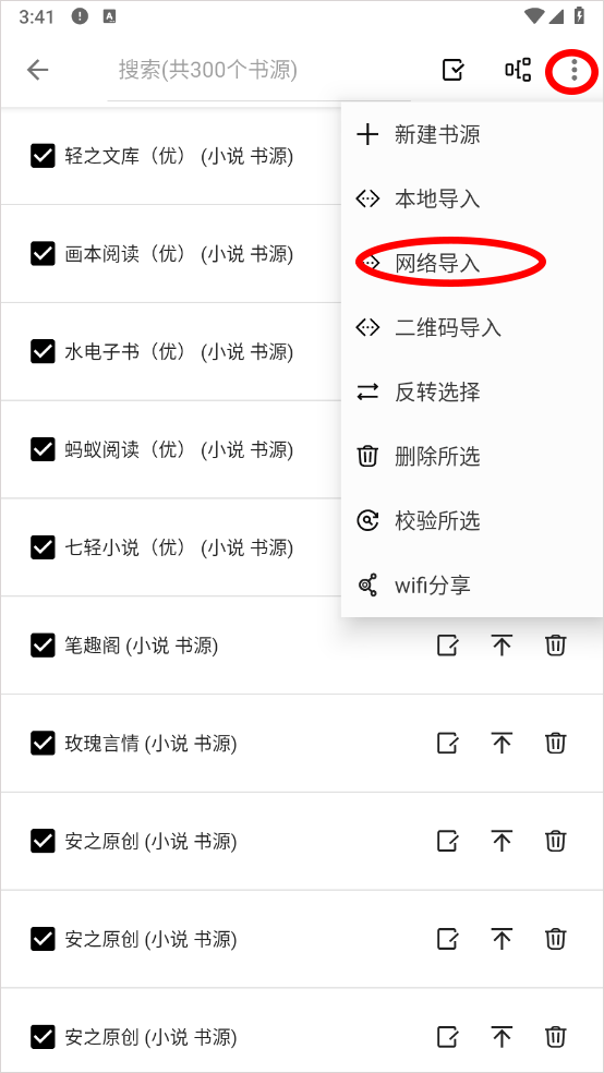 3、进入书源页面点击右上角的三点图标选择网络导入