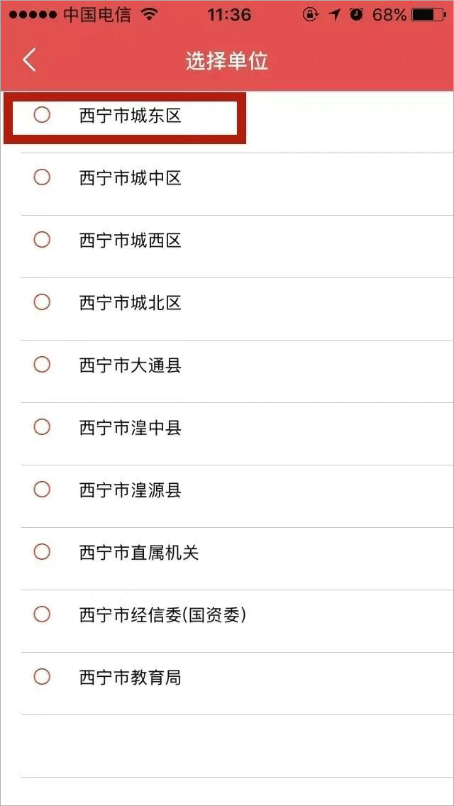5、选择单位 :请选择 西宁市城东区 - 中共西宁市城东区东关社区工作委员会 - 西宁市城东区东关社区五一居民委员会